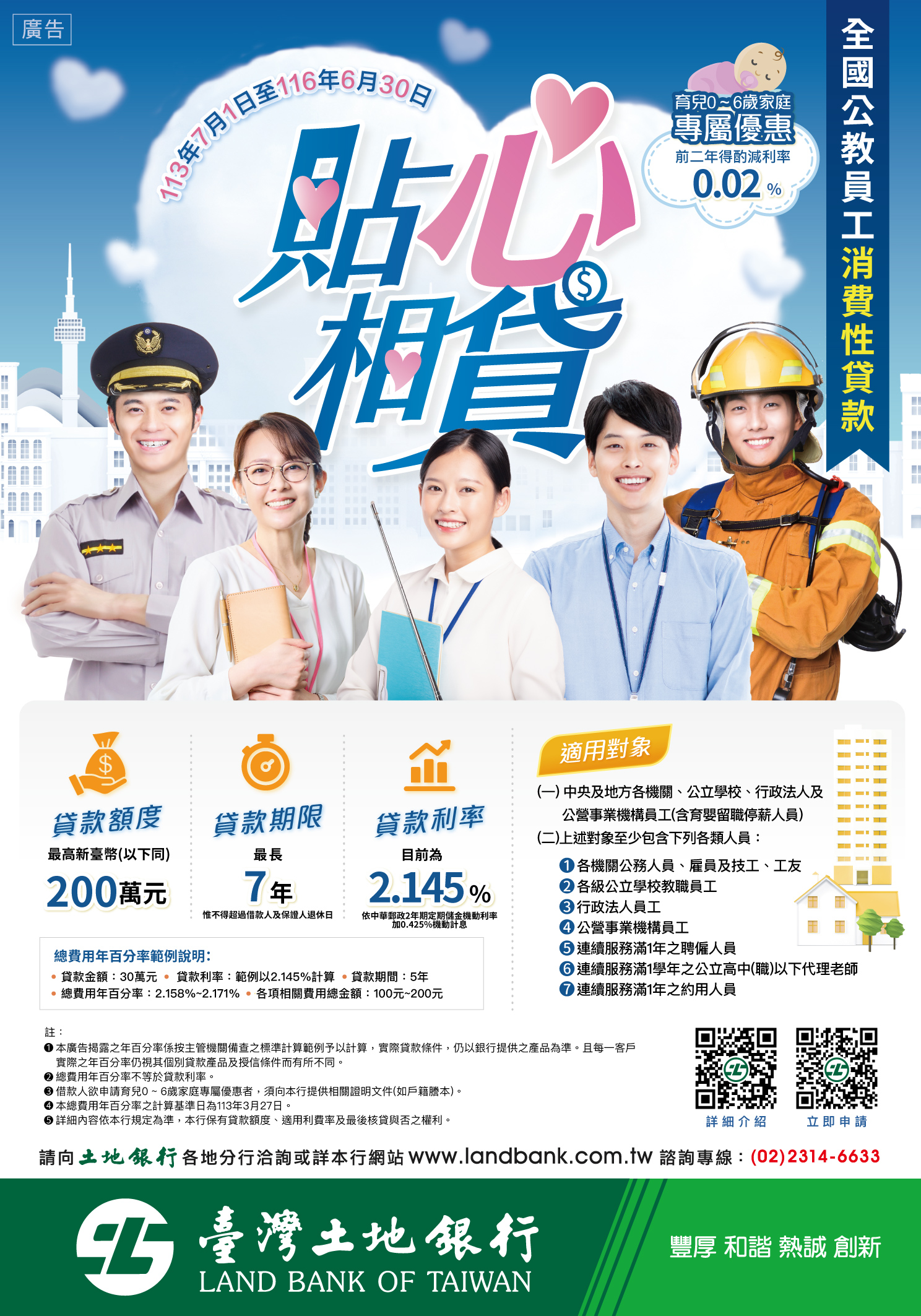 113年至116年「貼心相貸」-全國公教員工消費性貸款,經公開徵選由臺灣土地銀行獲選賡續承作