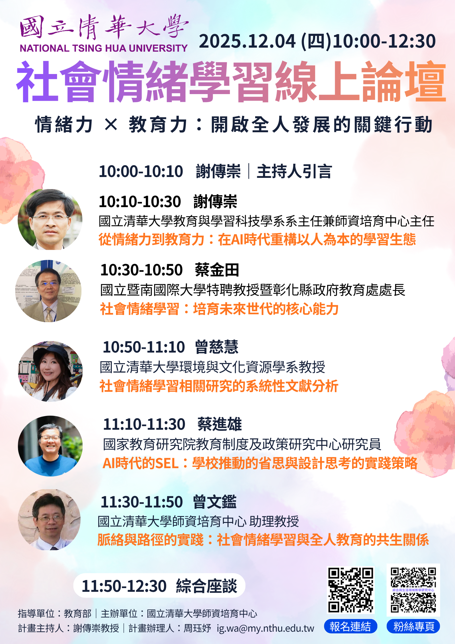 國立清華大學師資培育中心於114年12月4日辦理「社會情緒學習線上論壇-情緒力 × 教育力:開啟全人發展的關鍵行動」線上論壇