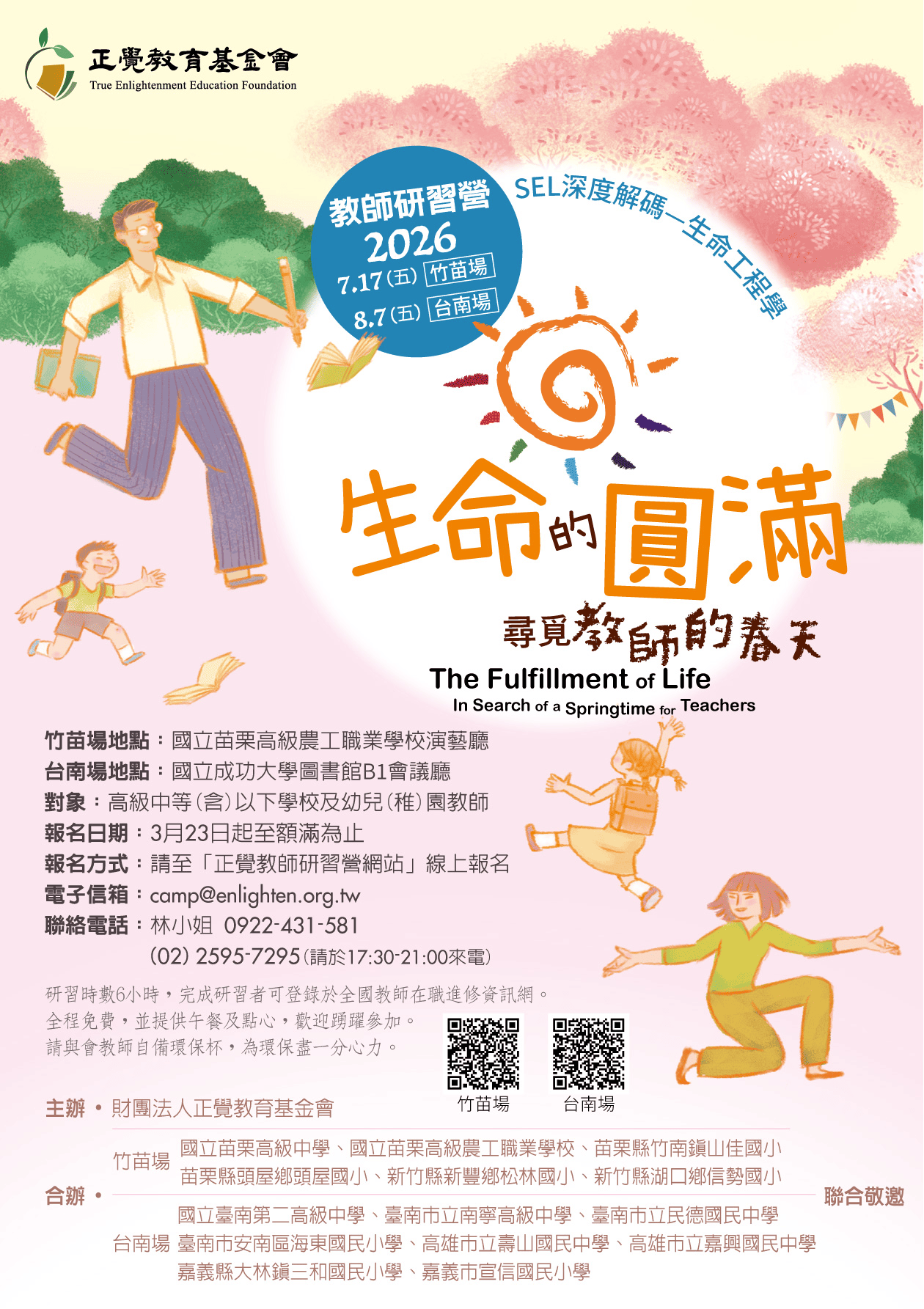 本基金會於2026年暑假期間舉辦竹苗、臺南兩場教師研習活動「生命的圓滿──尋覓教師的春天」如下: